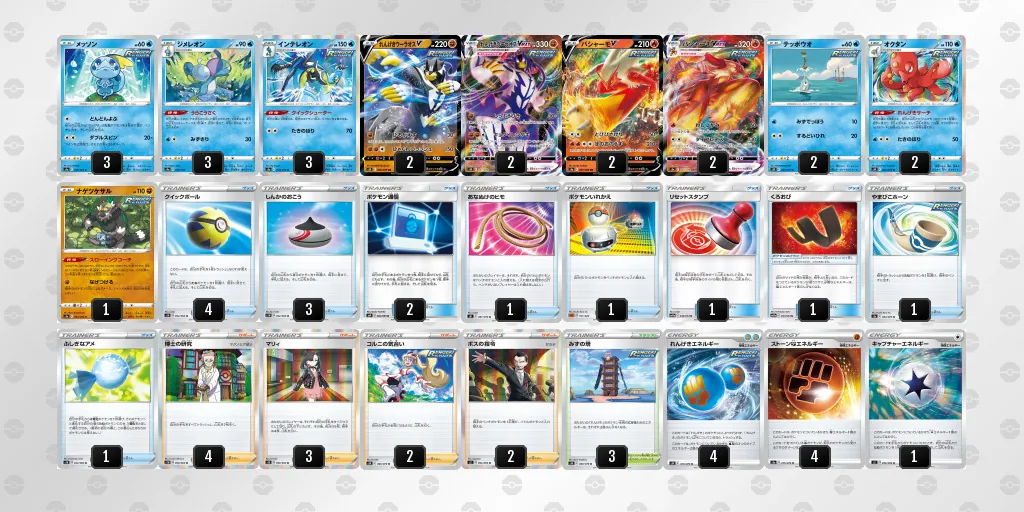 「ダイブレイズ」+「キョダイレンゲキ」ではダメージの総量が足らないため、そこを《インテレオン》の「クイックシューター」で埋めていきます。 また、このデッキの対策として一般的な《ミュウ》も《インテレオン》のが「クイックシューター」で回収することで無効化することができるでしょう。 いろいろ進化ラインも多く難しいデッキですが、すべての試合ですべてのカードを活用して戦うわけではなく、相手に合わせて必要なポケモンを場に出していくことが重要になります。