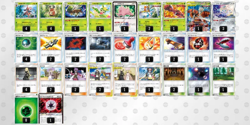 TAG TEAM GXを2体《コロトック》で倒そうとすると《コロトック》が4体必要になるのですが、サイド落ちの兼ね合いやトラッシュからポケモンを回収する手段がないことから難しいと判断しました。 《ビーストリング》もほぼほぼ必要ですが、デッキにGXポケモンを1枚を除いて採用していないため基本的に2ターンチャンスがあります。 こちらのプランを取るときは《メイ》や《ジラーチ》を活用して、パーツを事前にそろえるように心がけましょう。 ■終わりに