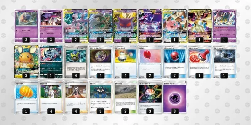 このデッキのメインアタッカーである《ミュウツー&ミュウGX》は、それ自体はゲームプランとしてはいなくてもどうにかなりますが、いるととてもプランが立てやすくなり、プレイ難易度も格段に変わるためサイド落ちを考慮して2枚採用しています。 そのほかのGXポケモンは《デデンネGX》を除き全て1枚ずつで採用しています。ここから何枚かピックアップして紹介していきたいと思います。