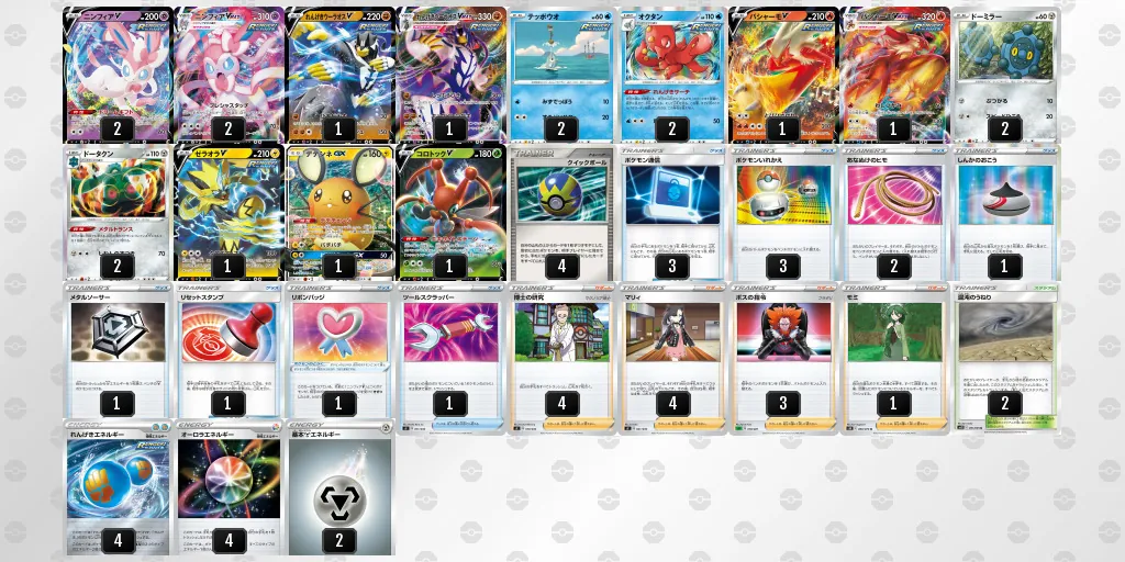 今回のデッキでは《ニンフィアVMAX》のワザ「ダイハーモニー」の追加効果を生かすために様々なタイプのポケモンを採用しています。 また、「ダイハーモニー」で削ったポケモンがベンチに逃げたとしても、「キョダイレンゲキ」や「クロスフィスト」のようなベンチポケモンにも大きなダメージを与えられるポケモンをしっかりスタンバイさせておくこともポイントとなります。