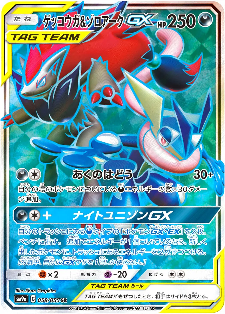 自分のトラッシュにある[悪]タイプの「ポケモンGX・EX」を2枚、ベンチに出す。 追加でエネルギーが1個ついているなら、新しく出したポケモンに、トラッシュにあるエネルギーを2枚ずつつける。[対戦中、自分はGXワザを1回しか使えない。]