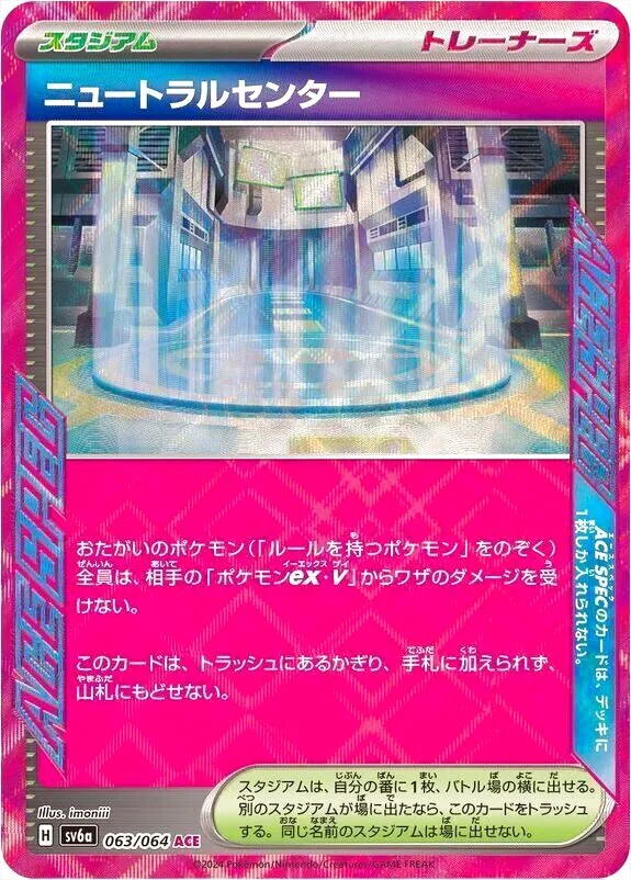 おたがいのポケモン(「ルールを持つポケモン」をのぞく)全員は、相手の「ポケモンex・V」からワザのダメージを受けない。 このカードは、トラッシュにあるかぎり、手札に加えられず、山札にもどせない。 スタジアムは、自分の番に1枚、バトル場の横に出せる。別のスタジアムが場に出たなら、このカードをトラッシュする。同じ名前のスタジアムは場に出せない。 ACE SPECカードは、デッキに1枚しか入れられない。
